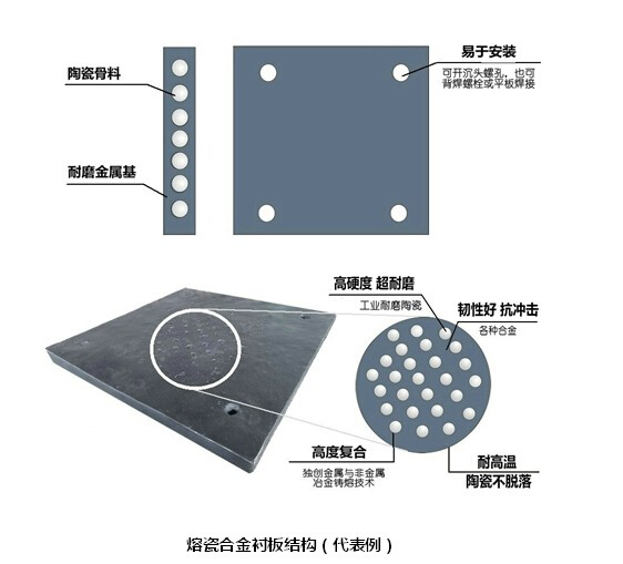 熔瓷耐磨襯板由耐磨陶瓷骨料和高韌金屬基構(gòu)成,巧妙的強(qiáng)化了成分材料的各自優(yōu)點(diǎn),避開了各自的弱點(diǎn),解決了陶瓷耐磨不抗沖擊,金屬有韌性而不耐磨的組合難題。